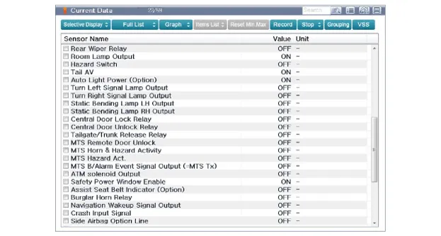 Los fallos de piezas del sistema eléctrico de la carrocería pueden diagnosticarse más rápidamente con el sistema de diagnóstico del vehículo (KDS/GDS). El sistema de diagnóstico (KDS/GDS) proporciona la siguiente información.