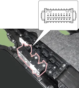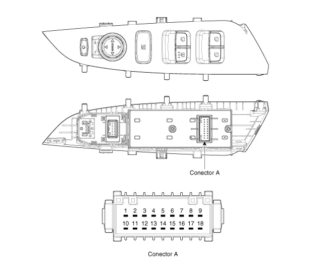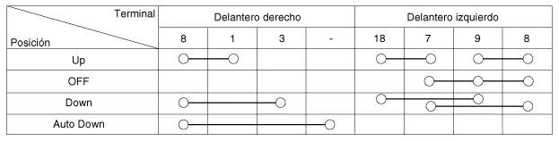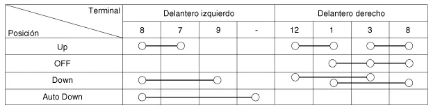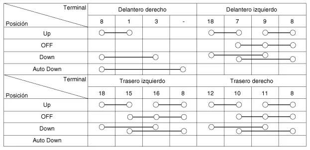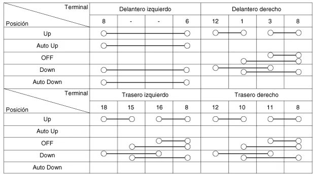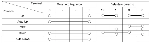 Compruebe si existe continuidad entre los terminales en cada una de las posiciones del interruptor, según la tabla. Si la continuidad no es la normal, cambie el interruptor. [Seguridad del conductor delantera / trasera - Subida/bajada automática] (IZQ)
