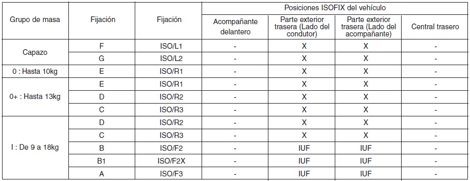 X = Posición ISOFIX no adecuada para sistema de seguridad para niños ISOFIX en el