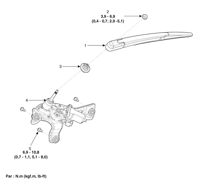 trasero 2 . Tuerca del brazo del limpiaparabrisas trasero 3 . Arandelas del limpiaparabrias trasero |