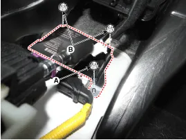 Afloje el perno (A) y las tuercas (B) y desmonte el módulo de control del sistema de retención suplementario (SRSCM).