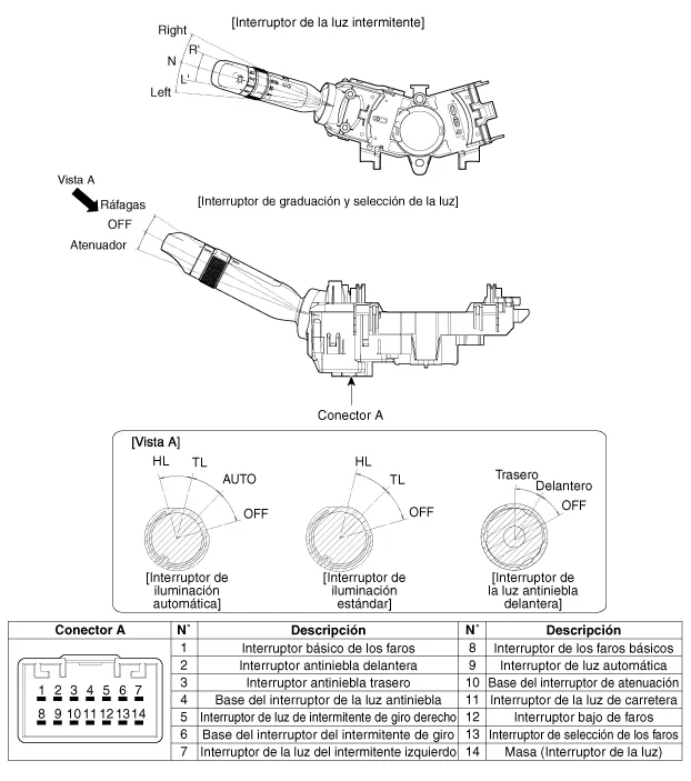 Desconecte el conector del interruptor multifuncional (A).