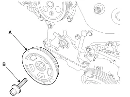 Desmonte el perno (B) de la polea del cigüeñal y la polea del cigüeñal (A).