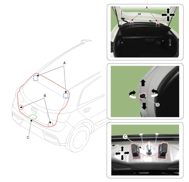 Una vez aflojados los pernos de fijación de la cerradura del portón trasero (C), ajuste la cerradura del portón trasero moviéndola hacia arriba y hacia abajo, hacia la derecha y hacia la izquierda.