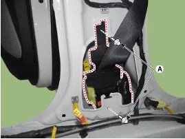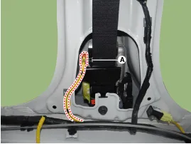 Desconecte el conector del pretensor del cinturón de seguridad (A) y desmonte el pretensor del cinturón de seguridad.