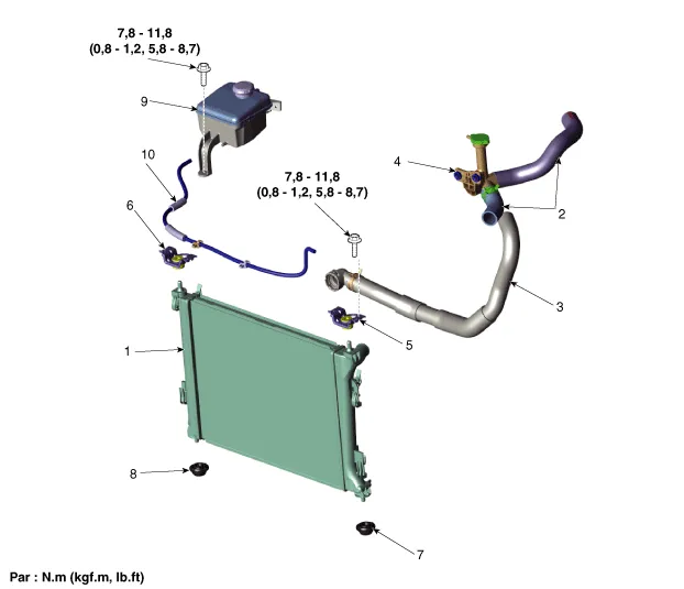 del radiador (DCH) 7. Aislante de montaje inferior del radiador [LH] 8. Aislante de montaje inferior del radiador [DCH] 9. Depósito de reserva 10. Manguera del depósito |