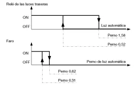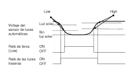 En caso de fallo: Si las luces automáticas fallan, deben encenderse los faros aunque sea de día y haya luz. Lo anterior está diseñado para evitar un cortocircuito en el faro cuando el fallo ocurre durante la noche. |