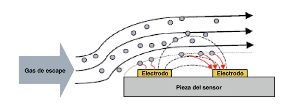 Las partículas (PM) en el gas de escape se adsorben en el electrodo. |