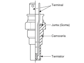 Después de submergir el termistor del sensor en el refrigerante del motor, mida la resistencia entre el terminal de señal ECTS y el terminal de masa. |