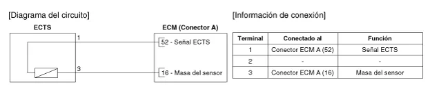 Eso significa que el resistor en el ECM y el termistor en el ECTS están conectados en serie. Cuando el valor de resistencia del termistor en el ECTS cambia de acuerdo con la temperatura del refrigerante del motor, el voltaje de salida cambia también. Durante la operación con el motor en frío el ECM aumenta la duración de inyección de combustible y controla el avance de encendido utilizando la información del refrigerante del motor para evitar que el motor se cale y mejorar la conducción.