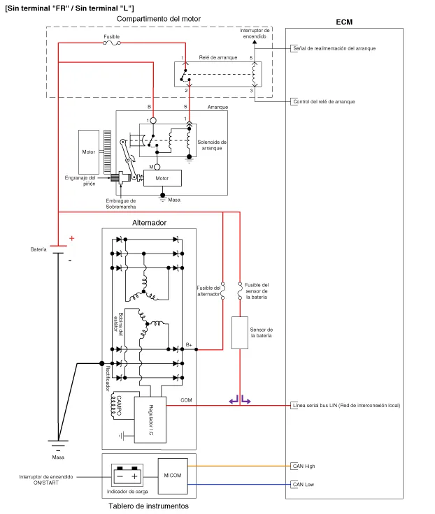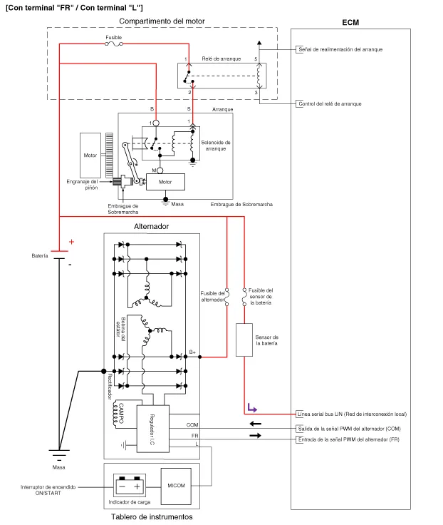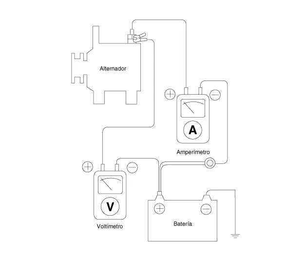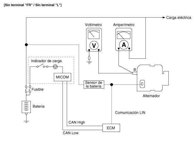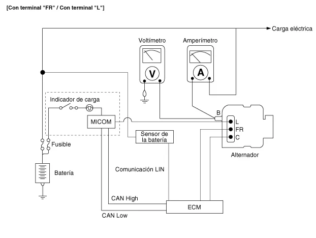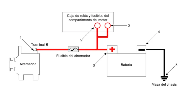 El sistema de carga incluye una batería, un alternador con un regulador integrado