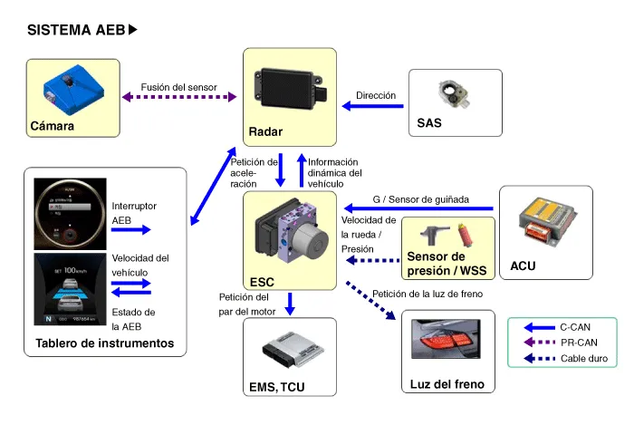 El AEB, al contrario que el SCC (control de crucero inteligente), funciona en un vehículo parado, así que el sistema utiliza el sistema objetivo de fusión para combinar el radar y la cámara.