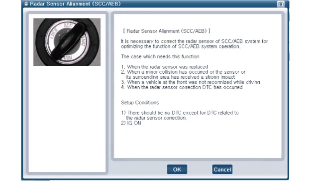 Para que el sensor del radar funcione correctamente, debe estar adecuadamente alineado en paralelo a la dirección de conducción del vehículo. Por ello, el procedimiento de alineación del sensor del radar debe llevarse a cabo después de reinstalar o cambiar el sensor por uno nuevo.