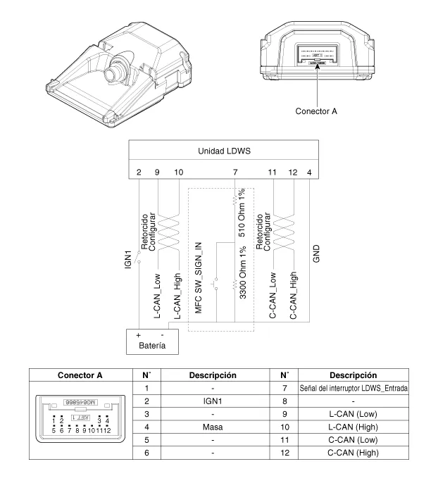 Componentes y localización de los componentes Componentes 1. Interruptor LDWS ON/OFF 2. Panel de instrumentos 3.